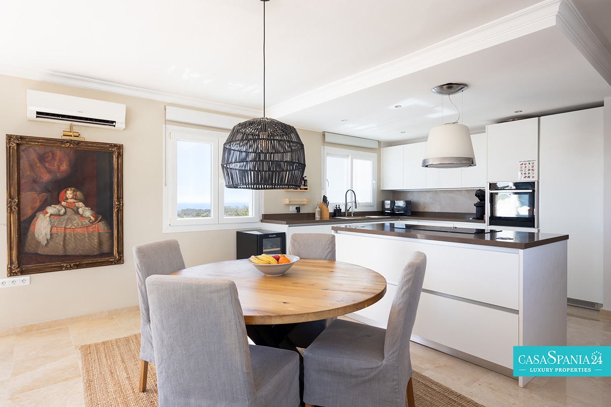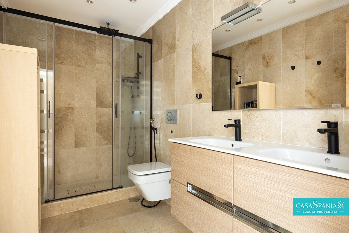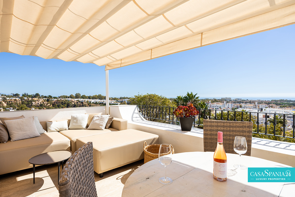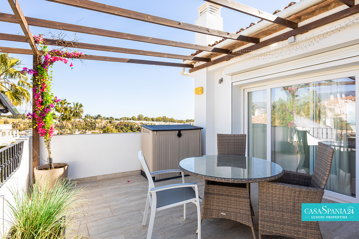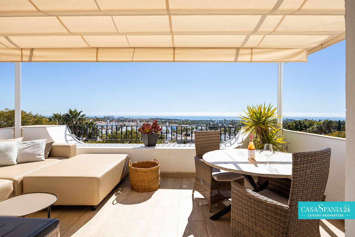 L'ampia terrazza di 44 m², esposta a sud, offre spettacolari viste panoramiche sul Mar Mediterraneo, sulle piscine e sui giardini paesaggistici, nonché sull'iconica montagna La Concha. È il luogo ideale per rilassarsi al sole, trascorrere serate indimenticabili con gli ospiti o ammirare gli splendidi tramonti di Marbella. Al contrario, la terrazza esposta a nord offre uno spazio più fresco e intimo, coperto da un'elegante pergola in legno, perfetto per barbecue e momenti di relax con vista sulle montagne.