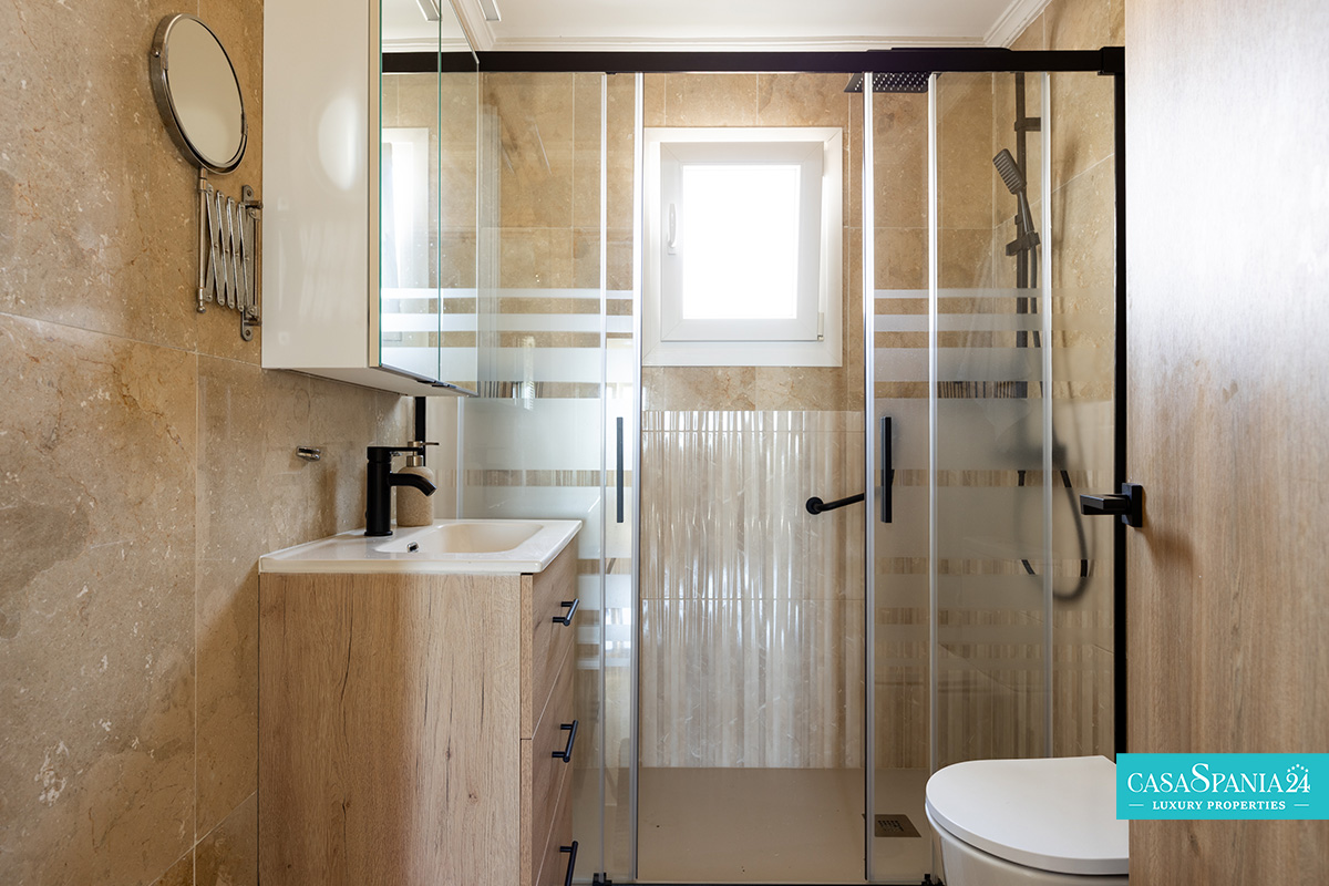 Gli interni sono rifiniti con materiali di alta qualità, con una moderna cucina attrezzata con elettrodomestici Neff e piani di lavoro in Silestone, pavimenti in marmo e caratteristiche come aria condizionata, stufa a pellet e finestre con doppi vetri. Entrambe le camere da letto sono dotate di armadi a muro e la camera padronale dispone di un moderno bagno privato con cabina doccia. Inoltre, la proprietà offre maggiore sicurezza grazie a una porta d'ingresso blindata.