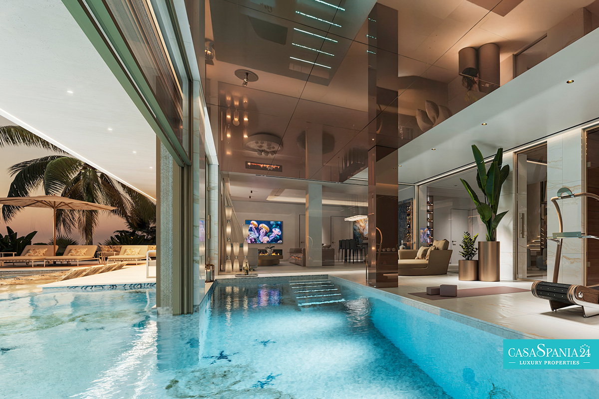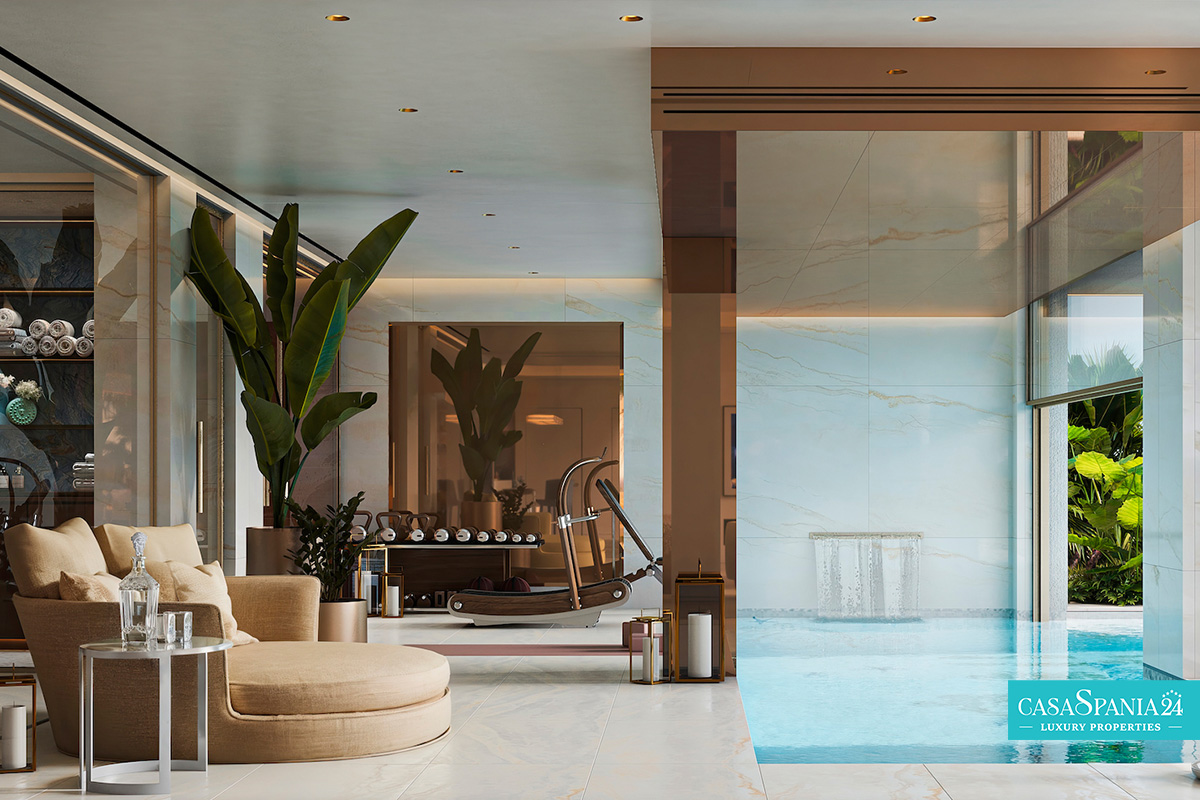 Il tranquillo atrio offre accesso privato tramite ascensore e una spa, coniugando funzionalità ed eleganza. La piscina interna, circondata da specchi a tutta altezza e pareti rivestite in marmo, si collega armoniosamente con l'area benessere e fitness, pensata per il relax e il benessere.