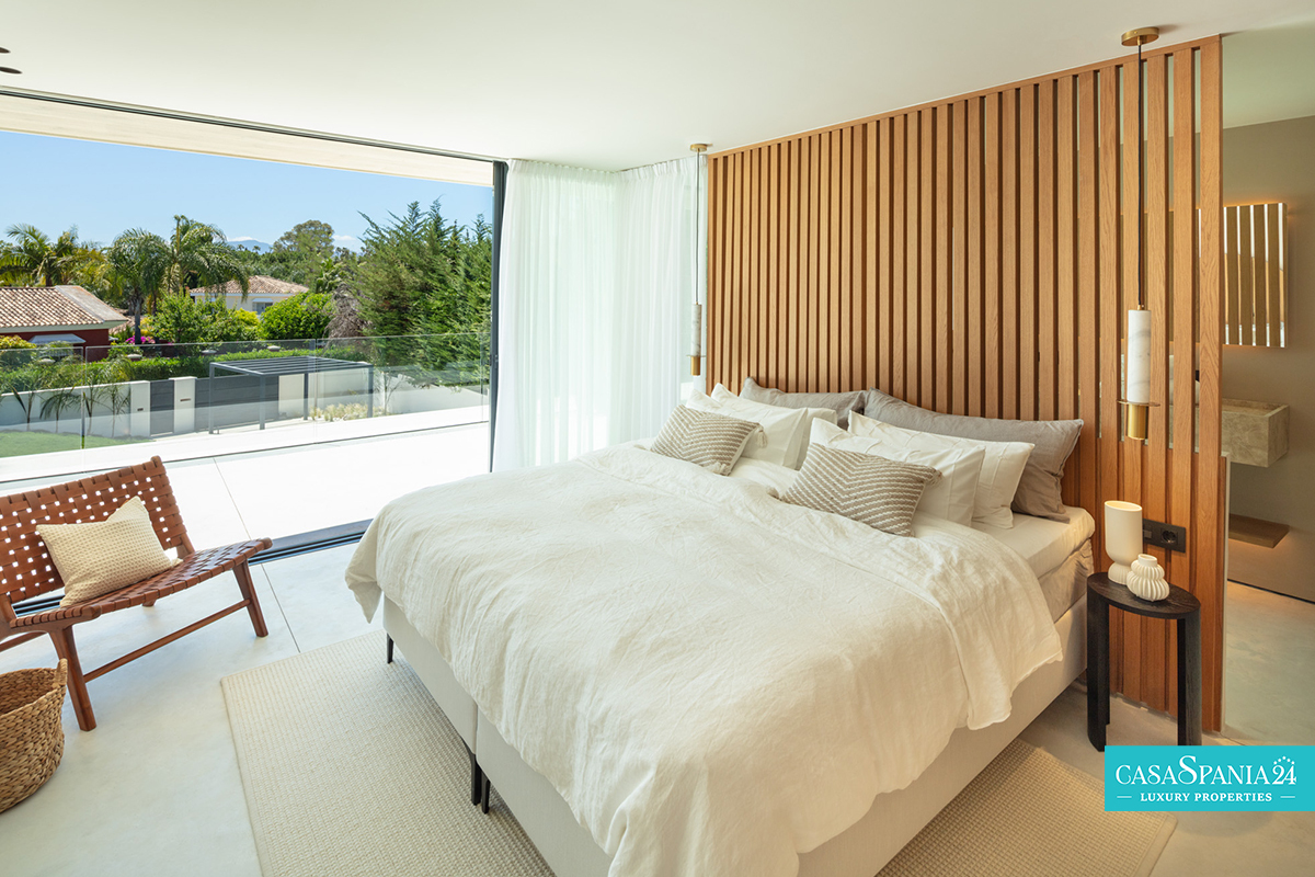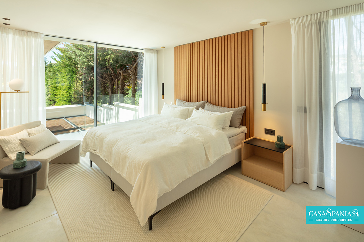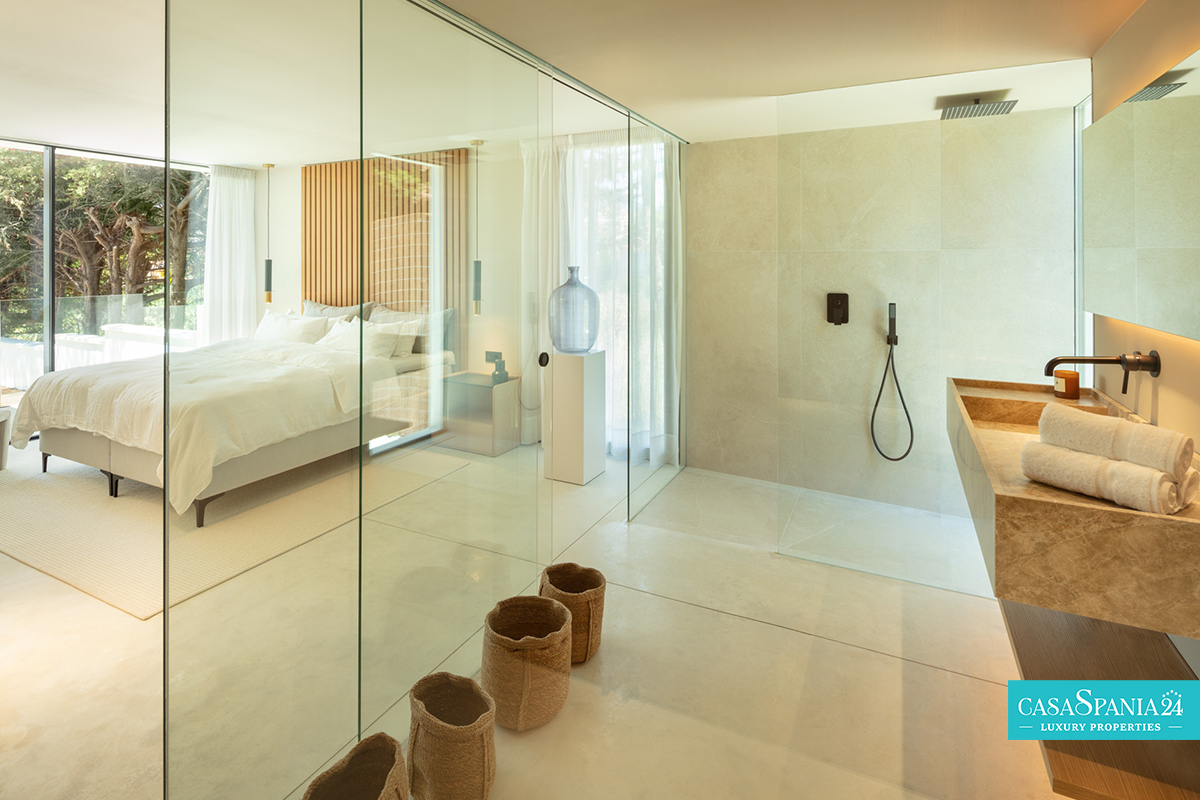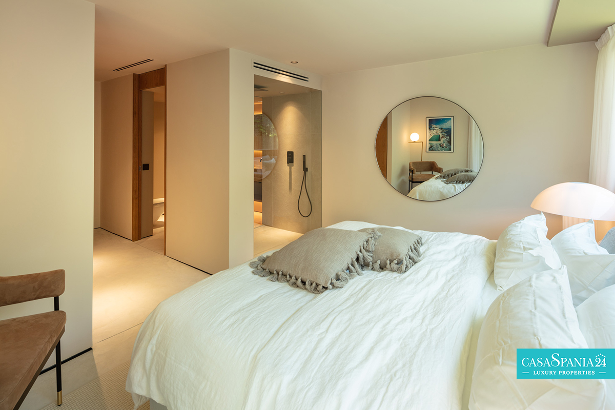La camera da letto principale è un vero e proprio santuario, con un bagno privato in stile spa e una vista spettacolare sui giardini paesaggistici. Il passaggio tra interno ed esterno è fluido, grazie alle ampie porte scorrevoli che conducono a un'oasi privata, completa di una splendida piscina, un rigoglioso giardino ed eleganti aree relax, perfette per momenti di relax o di intrattenimento sotto il sole del Mediterraneo.