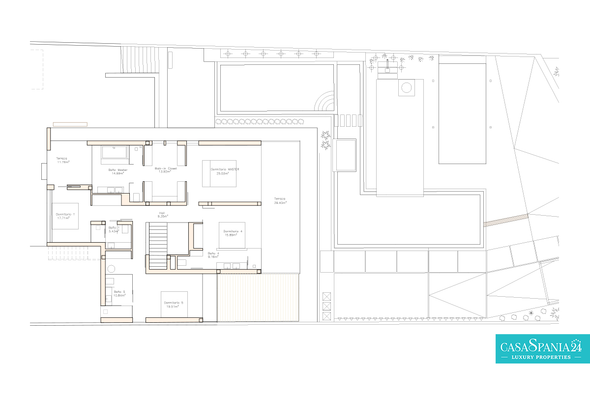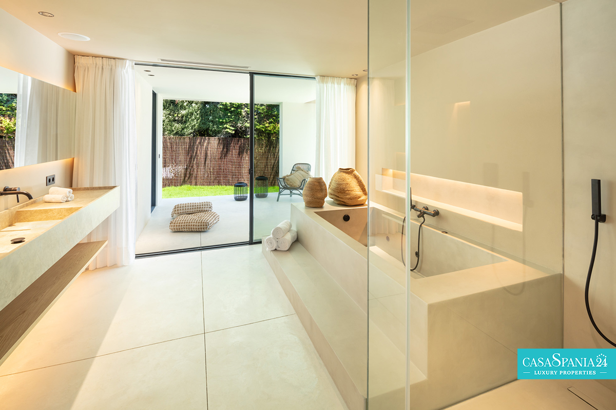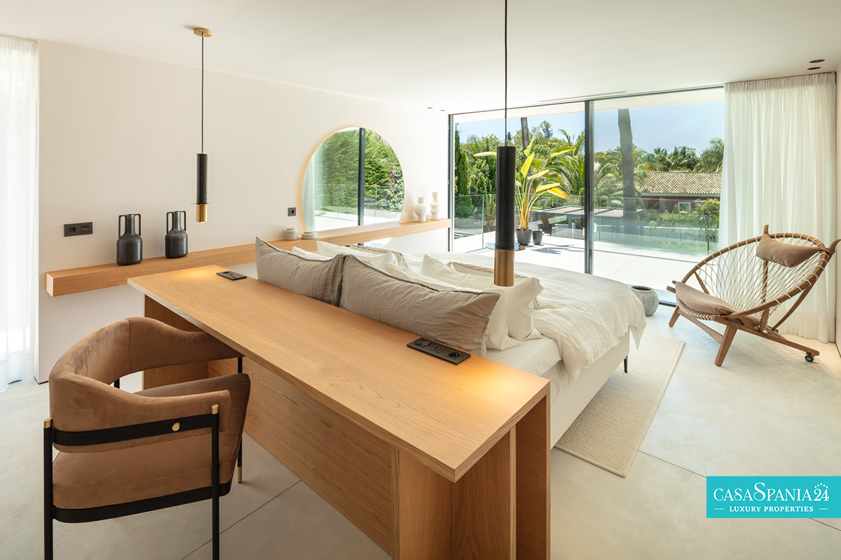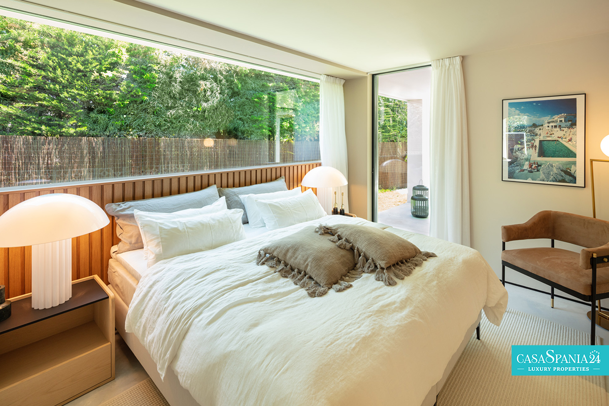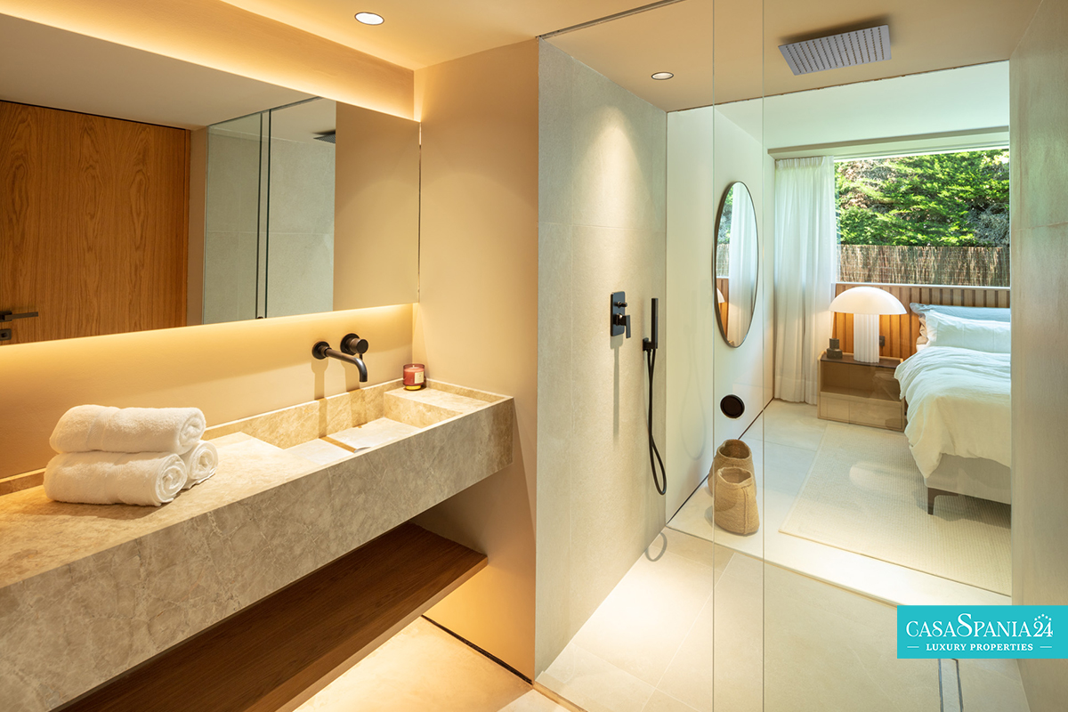 La camera da letto principale è un vero e proprio santuario, con un bagno privato in stile spa e una vista spettacolare sui giardini paesaggistici. Il passaggio tra interno ed esterno è fluido, grazie alle ampie porte scorrevoli che conducono a un'oasi privata, completa di una splendida piscina, un rigoglioso giardino ed eleganti aree relax, perfette per momenti di relax o di intrattenimento sotto il sole del Mediterraneo.